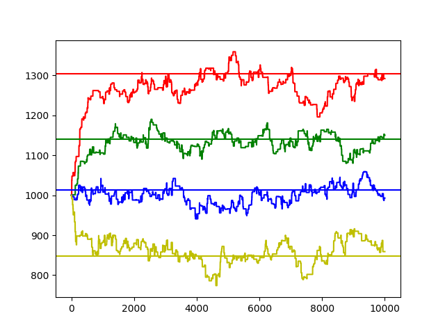 100명의 플레이어끼리 10000개의 복식 게임을 랜덤으로 돌린 결과는 아래와 같았다. 가로선이 실제 레이팅 값인데, 경기를 진행함에 따라 해당 값으로 수렴함이 뚜렷히 보인다.